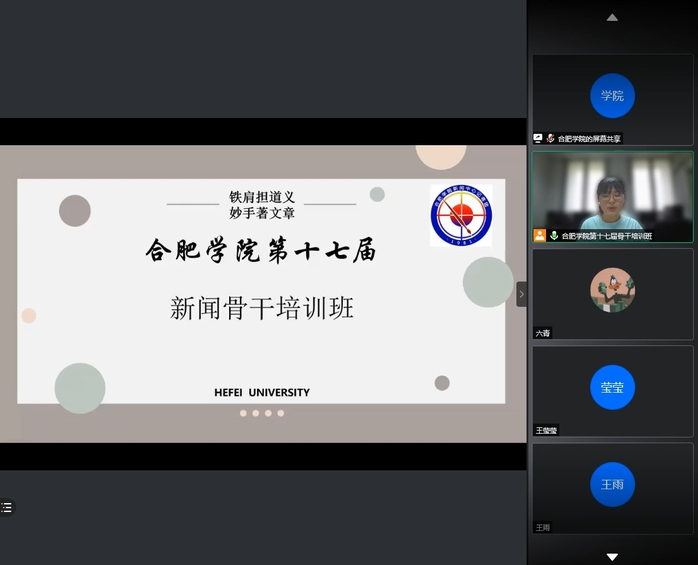 为庆祝中国共产党成立100周年,为党的百年大庆记载伟业、展示辉煌,引导青年学子讲好合院故事、传播校园正能量,由合肥学院党委宣传部主办、新闻中心记者团承办的第十七届新闻骨干培训班第一期和第二期讲座分别于5月27日和6月3日在线上拉开序幕。新华网安徽分公司融媒体工作室记者程天石和中国青年报安徽站记者王海涵应邀作新闻知识讲座,第十七届新闻骨干培训班200余名学员、新闻中心记者团全体成员参加讲座。