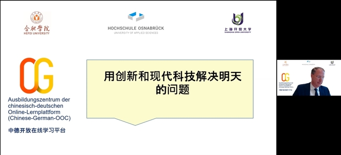 Im Namen des Bildungsministeriums der Provinz Anhui gratuliert  Zhang Geng zur Unterzeichnung der drei Hochschulen. Er sagte, dass die Universität  Hefei und die Hochschule Osnabrück einen guten Kooperationsmechanismus des gegenseitigen Respekts, der gegenseitigen Unterstützung und des gegenseitigen Vertrauens in engem Austausch etabliert und eine gemeinsame berufliche Entwicklung, eine gemeinsame Ausbildung von Studierenden und einen gemeinsamen Versuchsaufbau realisiert hätten. Er betonte, dass die Zusammenarbeit zwischen den drei Hochschulen  eine neue Erkundung und einen Fortschritt in der chinesisch-deutschen Zusammenarbeit und der integrierten Entwicklung des Jangtse-Deltas darstelle . Der Bau und die Aktivierung einer offenen Online-Lernplattform hät ten eine Online-Freundschaftsbrücke und Autobahn für deutsch-chinesische Zusammenarbeit und Austausch errichtet. Es erschloss neue Bereiche und neue Räume für die deutsch-chinesische Zusammenarbeit und den Austausch. Das Bildungsministerium der Provinz Anhui wird  weiterhin die Kooperationsprojekte der Universität Hefei und die Errichtung einer hochrangigen Universität  der  Universität Hefei unterstützen.