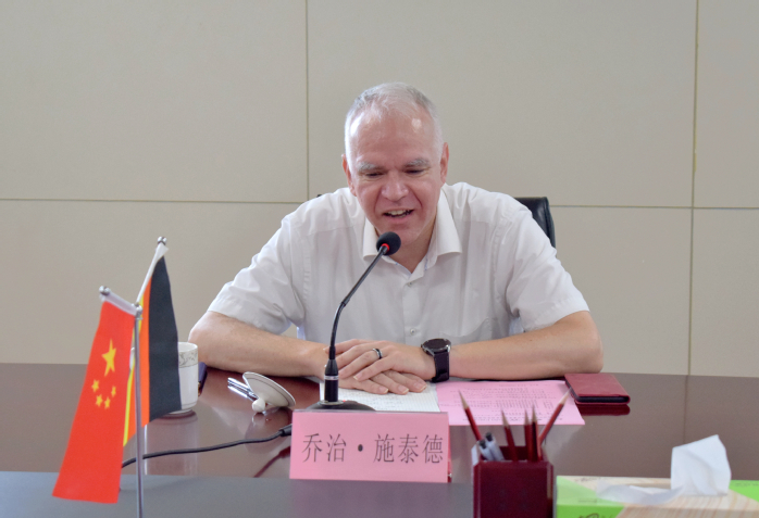 Georg Stadler stellte kurz die Entwicklungsgeschichte der Hanns-Seidel-Stiftung und die Hauptarbeit des Repräsentativbüros in Shanghai vor. Er sagte, dass die HSS am 6. Juli ein Kooperationsabkommen mit dem Bildungsministerium der Provinz Anhui unterzeichnet habe. Der Besuch sei der erste Schritt für die Stiftung, ihre Bildungskooperation mit der Provinz Anhui zu stärken. Er war tief beeindruckt von dem kooperativen Bildungsmodell zwischen der Universität Hefei und den deutschen Fachhochschulen und freute sich sehr, dass das deutsche „duale System“ schon lange in der Universität Hefei Fuß gefasst habe. Er hoffte, dass die HSS einen Beitrag zur Zusammenarbeit zwischen der Universität Hefei und Hochschulen in Bayern leisten könne.