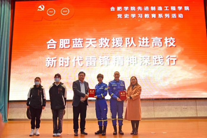 为进一步学习贯彻十九届六中全会精神,扎实推进党史学习教育,12月6日下午,我校先进制造工程学院联合合肥市蓝天救援队开展 “合肥蓝天救援队进高校 新时代雷锋精神深践行”大学生主题思政教育讲座。校党委委员、宣传统战部部长贾峰,先进制造工程学院党委书记杜娟、团委副书记钟伦锁、研究生党支部书记沈丹丹,合肥市蓝天救援队党支部书记刘晓冬、队长苏琴,合肥太古可口可乐饮料有限公司党总支书记夏敏、工会主席李煜晨以及三家单位优秀党员代表共同参加本次活动,讲座由先进制造工程学院机制学生党支部书记威力旺主持。