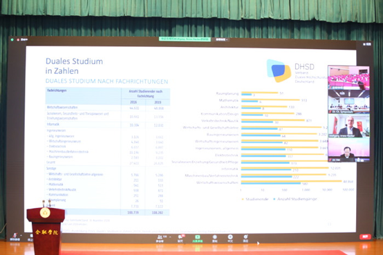 Prof. Dr.-Ing. Wolfgang Arens-Fischer, Institutsleiter und Studiendekan für Duale Studiengänge an der Hochschule Osnabrück, machte „Duales Studium in Deutschland und an der Hochschule Osnabrück“ zum Gegenstand seiner Rede, in der er die Entwicklungsgeschichte und momentane Lage des dualen Systems an angewandten Hochschulen Deutschlands erläuterte. Er präsentierte das duale System als flexibel und praxisbezogen, weil dieses System es den Studierenden ermöglichen könne, neben theoretischen Kenntnissen mehr praxisorientierte Erfahrungen zu erwerben. Nach 10-jährigen Bemühungen von beiden Seiten seien immer mehr Studierende nach dem dualen System ausgebildet worden. Das Unterrichtsdesign sei vielfältig und das Bildungssystem sei besser geworden, insbesondere im Fachbereich von Ingenieurwissenschaft, Elektrotechnik und Computertechnik.