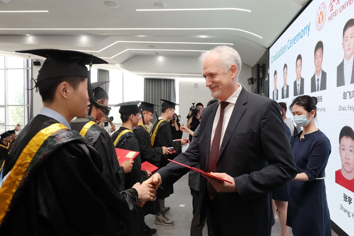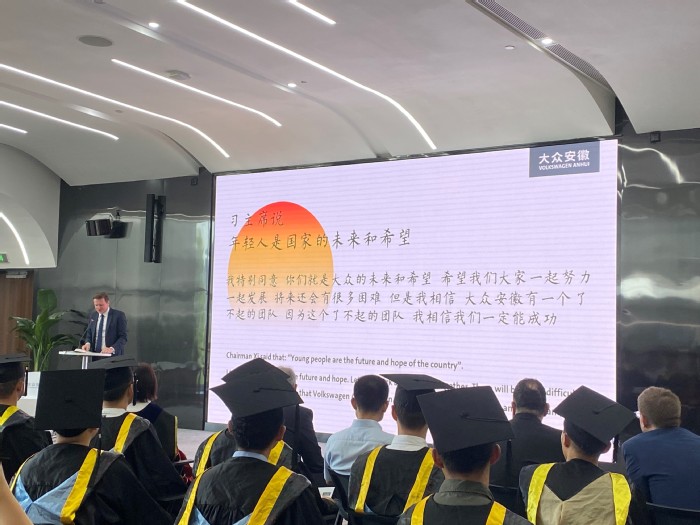 6月16日上午,我校和大众集团合作培养的首批“种子工程师”顺利毕业,校长吴春梅出席大众安徽举行的毕业典礼。大众中国执行副总裁傅勤彦先生、大众安徽首席执行官葛皖镝博士、首席制造官施耐德先生、首席技术官吕尔曼博士、首席人力资源官邵剑先生以及校长办公室、教务处、国际交流合作处、先进制造工程学院、人工智能与大数据学院相关领导和老师共同参加毕业典礼。