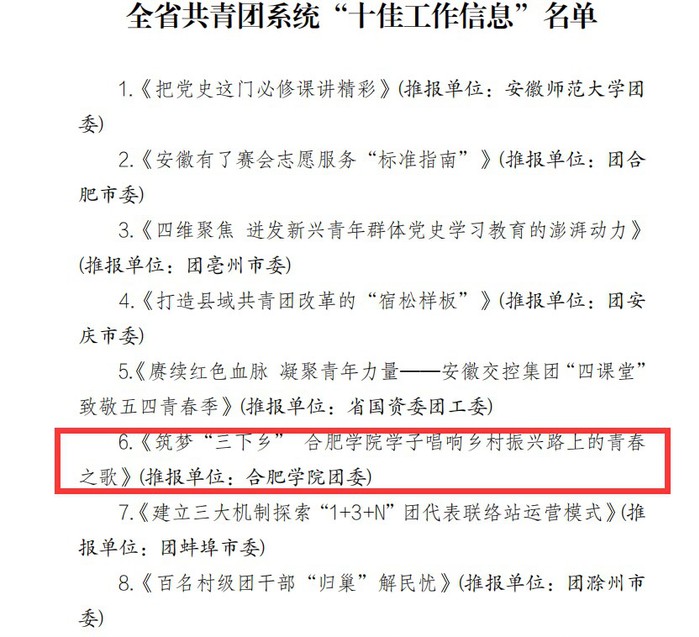 近日,由共青团安徽省委主办的安徽共青团系统“十佳工作信息”评选结果揭晓,我校推报的作品《筑梦“三下乡”合肥学院学子唱响乡村振兴路上的青春之歌》荣获2021年度安徽共青团系统“十佳工作信息”。