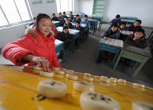 3月5日,合肥学院大学生周洁在给孩子们上象棋课。新华社记者 刘军喜 摄
