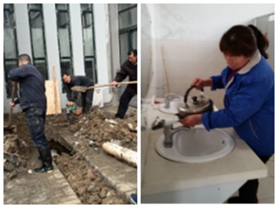 1月22日开始的一场罕见寒潮来袭,气温骤降到零下10度以下,为保证校园运转,按照省、合肥市政府文件精神和院领导的部署,后勤部门积极筹划,后勤各部门、各物业公司一方面开展正常维修维护,另一方面加强防寒防冻,准备防冻剂、清扫积雪工具、关闭门窗、水阀,加强巡查,严防死守。然而肆虐的寒潮还是给我们带来不少的麻烦,北一区和北区8号楼住宅楼水管爆裂,一期校园1号教学楼二楼卫生间水阀爆裂、校园主水管泄露、留学生公寓外围消防水管破裂,体育馆、图书馆消防管道和公寓楼学生宿舍多处水管被冻裂等等,告急不断。险情就是命令,后勤人员不畏严寒,哪里需要就奋战在哪里,不分昼夜。他们冒着大雪,加班加点,开挖地面,在冰冷刺骨的寒水中一干就是几个小时,检修更换,排除问题,为校园正常运转默默工作着。