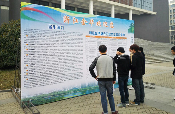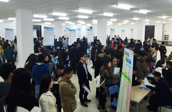 3月5日周六下午,浙江省金华市人社局组织当地38家规模以上企业在我校图书馆一楼下沉式室大厅举办了专场招聘会。参加招聘的38家企业所需专业基本覆盖了我校2016届毕业生所有专业。招聘会现场毕业生们摩肩接踵,到处都是拿着简历奔走的身影。其中绿源集团有限公司最受欢迎,招聘桌前排起了长龙,部分毕业生表示在浙江金华这些东南经济发达地区的企业发展机会较多,福利待遇较高,他们对其充满了兴趣。