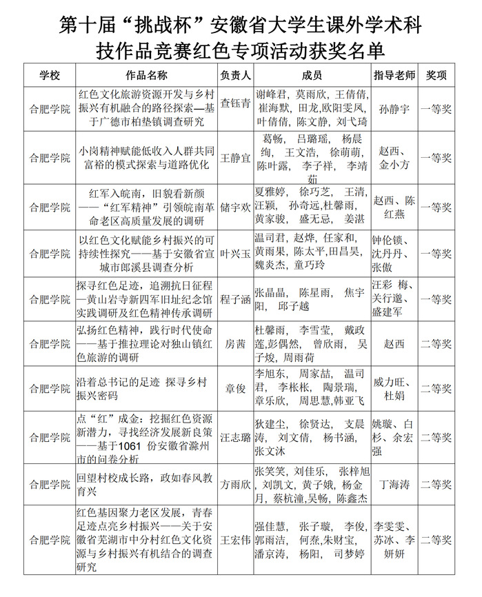 红色专项活动是“挑战杯”课外学术科技作品竞赛的一个专项赛,旨在鼓励团员青年以实践活动为载体,通过红色主题社会实践和调查研究,创新实践活动内容,切身感受新时代国家发展的伟大成就。校赛阶段,我校共计收集作品29项,经评选,最终推荐12项作品参加省赛,其中《红色文化旅游资源开发与乡村振兴有机融合的路径探索—基于广德市柏垫镇调查研究》《小岗精神赋能低收入人群共同富裕的模式探索与道路优化》《红军入皖南,旧貌看新颜——“红军精神”引领皖南革命老区高质量发展的调研》《以红色文化赋能乡村振兴的可持续性探究——基于安徽省宣城市郎溪县调查分析》《探寻红色足迹,追溯抗日征程——黄山岩寺新四军旧址纪念馆实践调研及红色精神传承调研》荣获省赛一等奖。