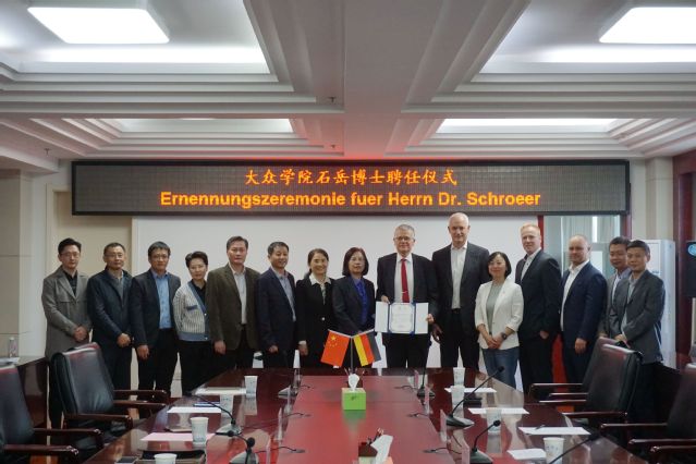 Dr. Klaus Schröer dankte der Hefei-Universität für das in ihn gesetzte Vertrauen und die Einstellung von Sonderprofessor. Er sagte, er freute sich sehr, wieder nach China zurückzukehren und mit seinem Fachwissen zur Zusammenarbeit zwischen der Universität Hefei und dem Volkswagen Konzern beizutragen. In Zukunft wird er als Bindeglied die intensive Zusammenarbeit zwischen dem Volkswagen Konzern und der Universität Hefei fördern und seine reiche praktischen Erfahrungen und sein innovatives Denken in den Unterricht einbringen, um der Universität Hefei neue Impulse zu geben und die Qualität der Talentförderung umfassend zu verbessern.