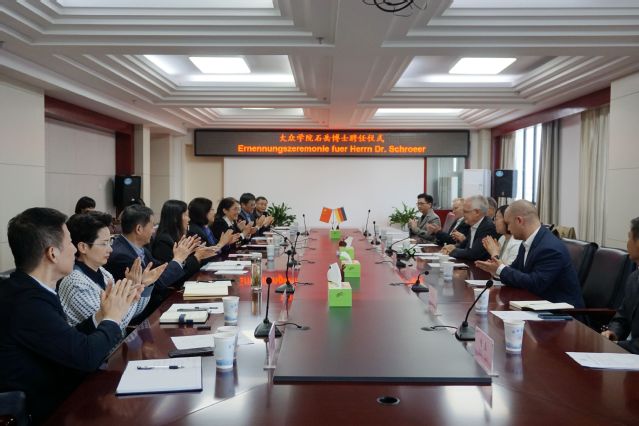 Am Morgen vom 8. Oktober hielt die Hefei-Universität die Ernennungszeremonie für Sonderprofessoren ab und stellte Dr. Klaus Schröer, ehemaligen Vorstand und Ingenieur des Volkswagen Konzerns, als Sonderprofessor im Volkswagen-Institut auf Vollzeitbasis ein. An der Zeremonie nahmen Präsidentin Wu Chunmei, Direktor der Abteilung für Organisation Bai Yixiang, Direktor der Abteilung für Studentenangelegenheiten und Dekan des Volkswagen-Instituts Wang Xiaofeng, Direktor der Personalabteilung Ji Ping, Direktor der Abteilung für internationalen Austausch und Zusammenarbeit Zhang Hui, Parteisekretär des Volkswagen-Instituts Xuan Yuewen, Dekan des Instituts für fortgeschrittene Fertigungstechnik Hu Xueyou und die zuständigen Lehrkräfte teil. Dr. Harry Schneider, Chief Manufacturing Officer von Volkswagen Anhui, Zhu Jiangping, Director of Efficiency Management von Volkswagen Anhui, und Hendrik Dippe, Director of Maintenance Department von Volkswagen Anhui, waren zur Teilnahme an der Zeremonie eingeladen. Die Zeremonie wurde von Vizepräsidentin Chen Xiu geleitet.