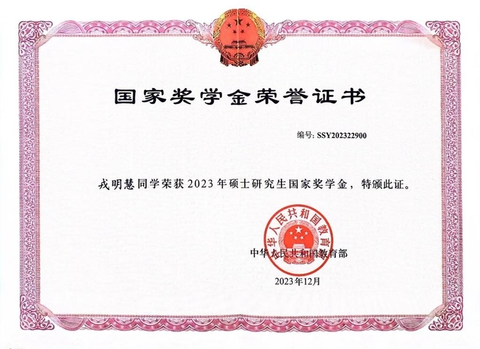 戎明慧表现优异,成绩名列前茅,综合考评连续两年位居班级第一,并荣获2023年国家奖学金、2022年和2023年校学业一等奖学金,于2023年光荣地加入了中国共产党。